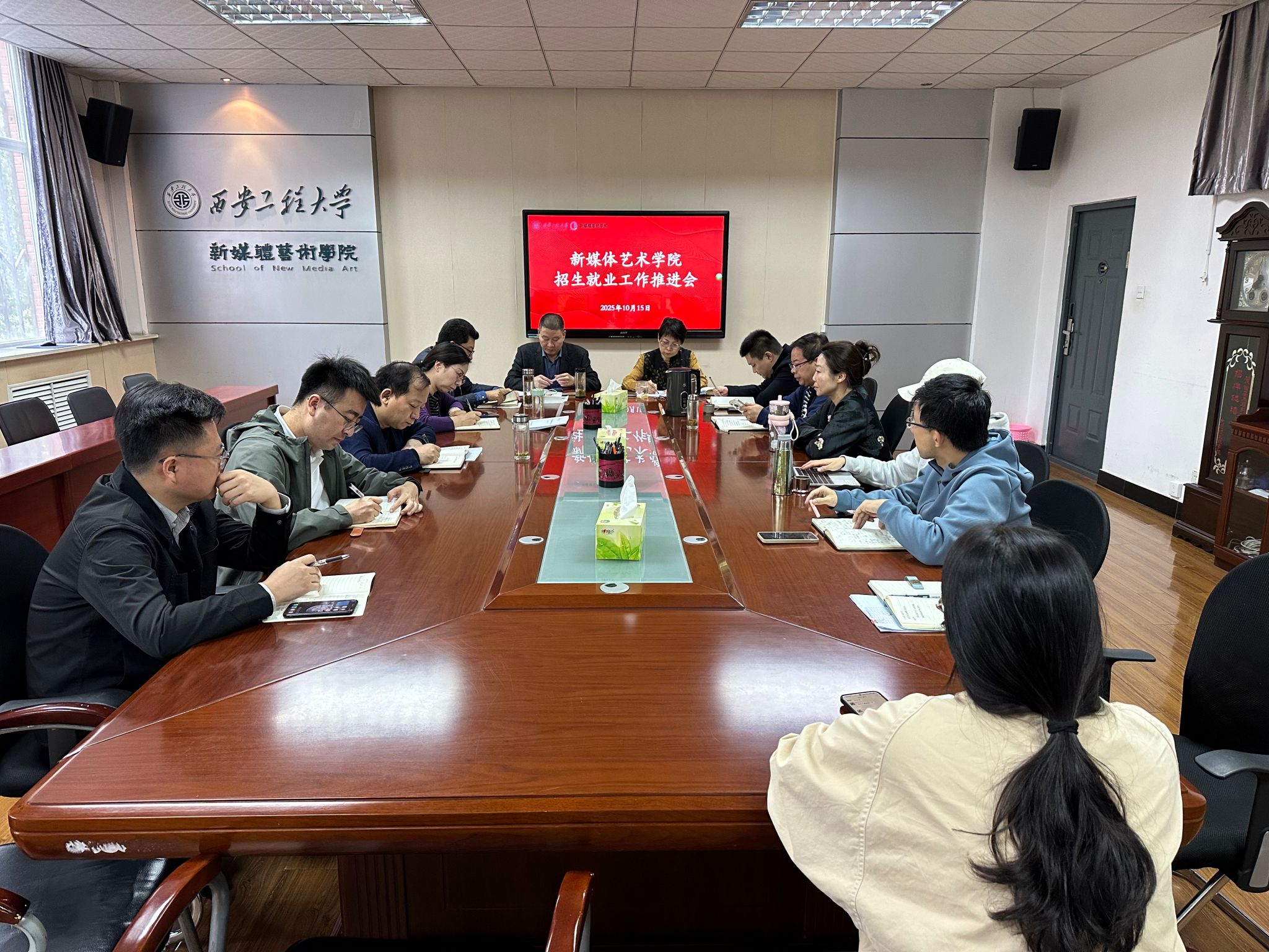 10月15日下午,星辰影院 招生就业工作推进会在金花校区8号教学楼326会议室召开。学院领导班子成员、各系办主任、毕业班辅导员、研究生辅导员参加会议。会议由新媒体学院党委书记张瑾主持。