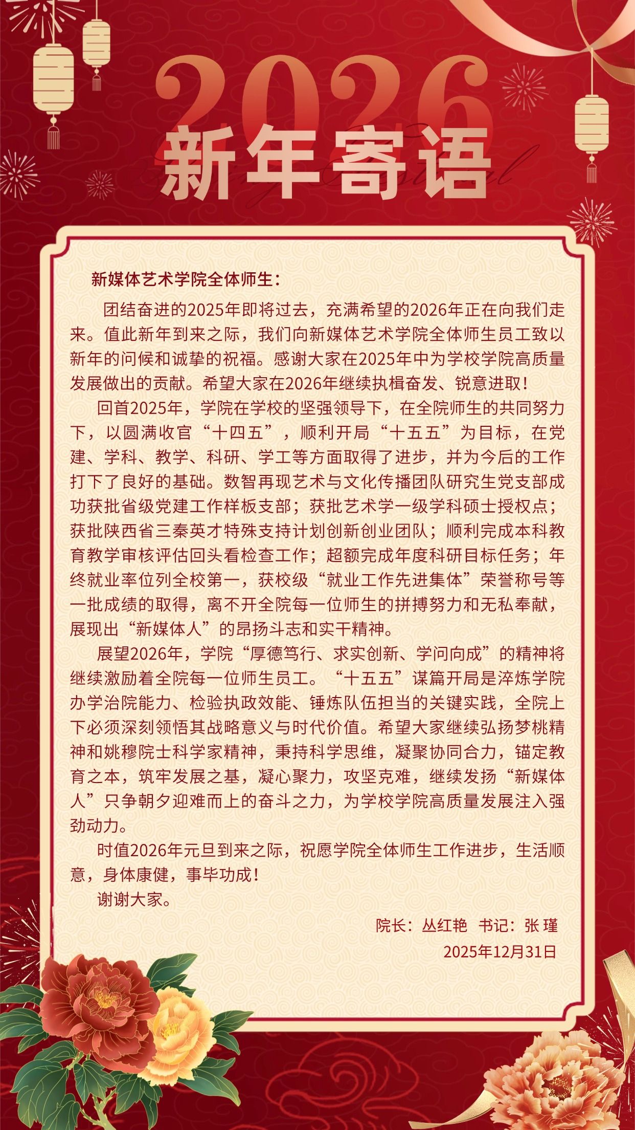 时值2026年元旦到来之际,祝愿学院全体师生工作进步,生活顺意,身体康健,事毕功成!